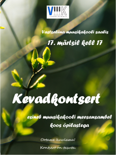 Tervitame kevade saabumist meeleoluka kontserdiga meie muusikakooli meesansambli ja õpilaste esitluses.