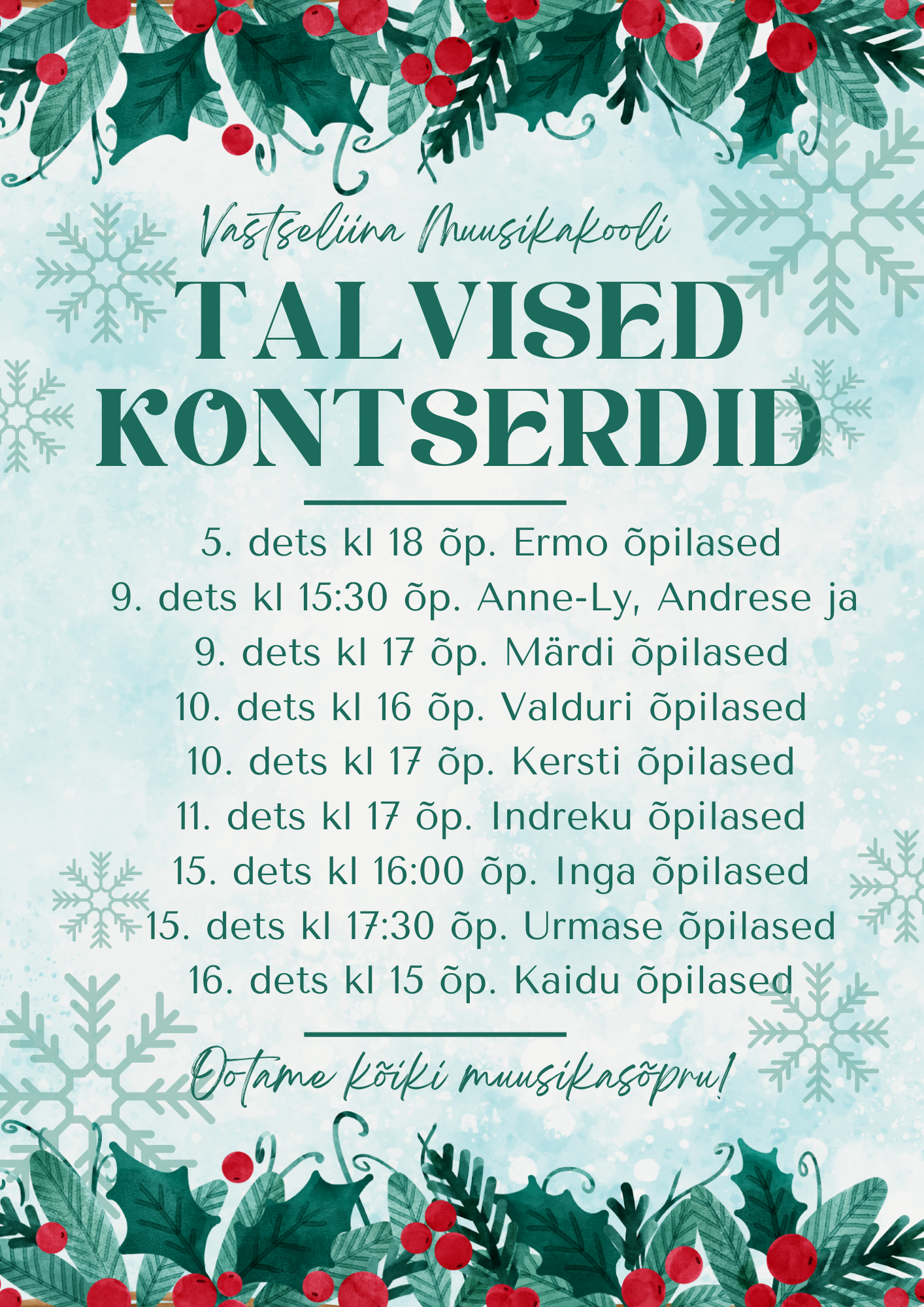 Ootame kõiki õpilasi, lapsevanemaid, sõpru ja muusikahuvilisi kuulama!